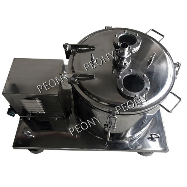 The PPTD centrifuge is top discharging, hermetic closure type equipment. The material is fed into the drum through the feeding pipe on the hermetic closure casing; under the action of the centrifuge force field, the liquid-phase passes through the filter medium and the discharged out of the machine, while the solid-phase material is retained inside the drum and, after the machine is stopped, the material is discharged from the top. The centrifuge has such features as smooth running, easy & convenient operation as well as conducting feeding, washing and dehydrating under the state of hermetic closure, etc.